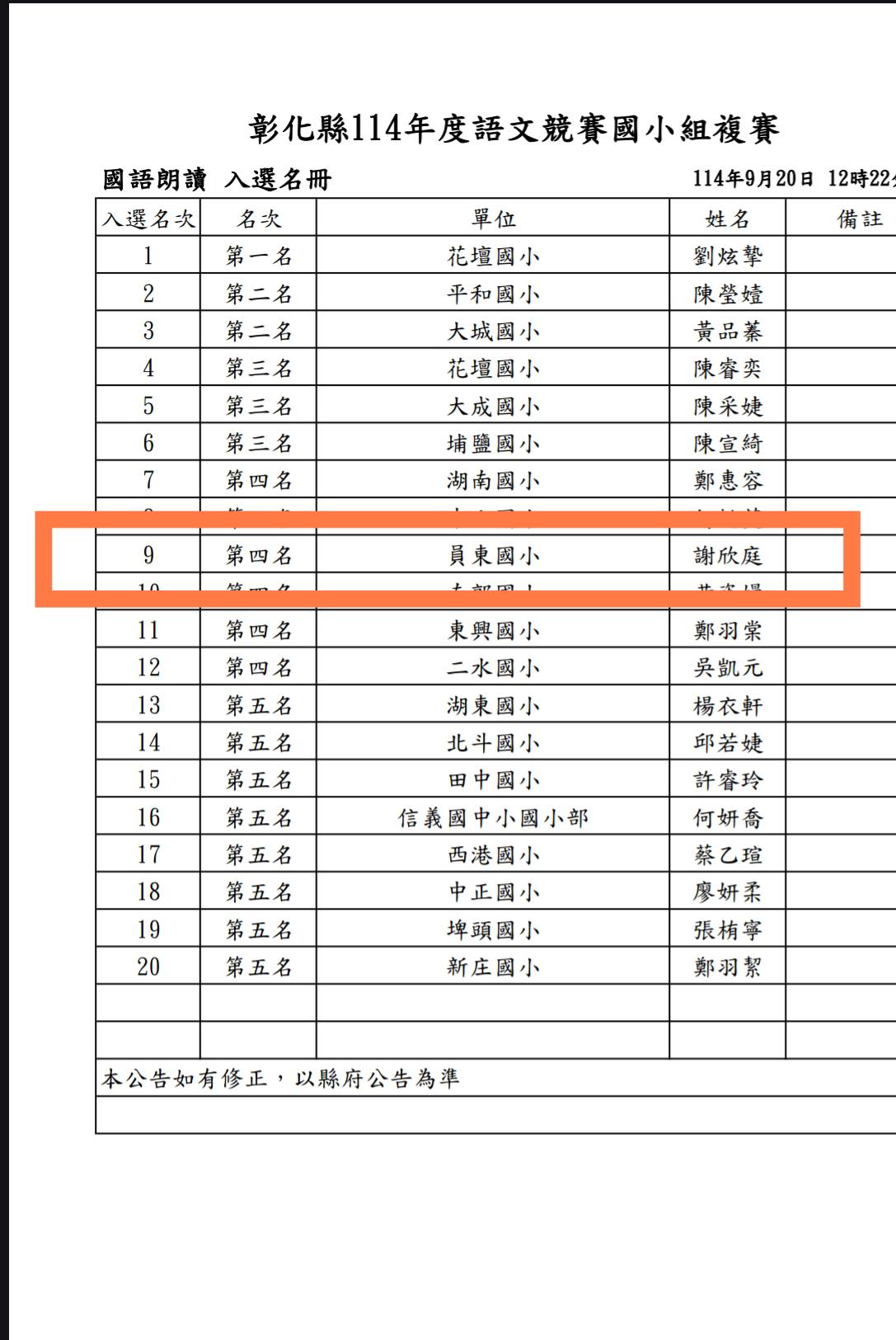 賀!六年乙班謝欣庭參加彰化縣114年度語文競賽國小組複賽 榮獲 國語朗讀組第四名!