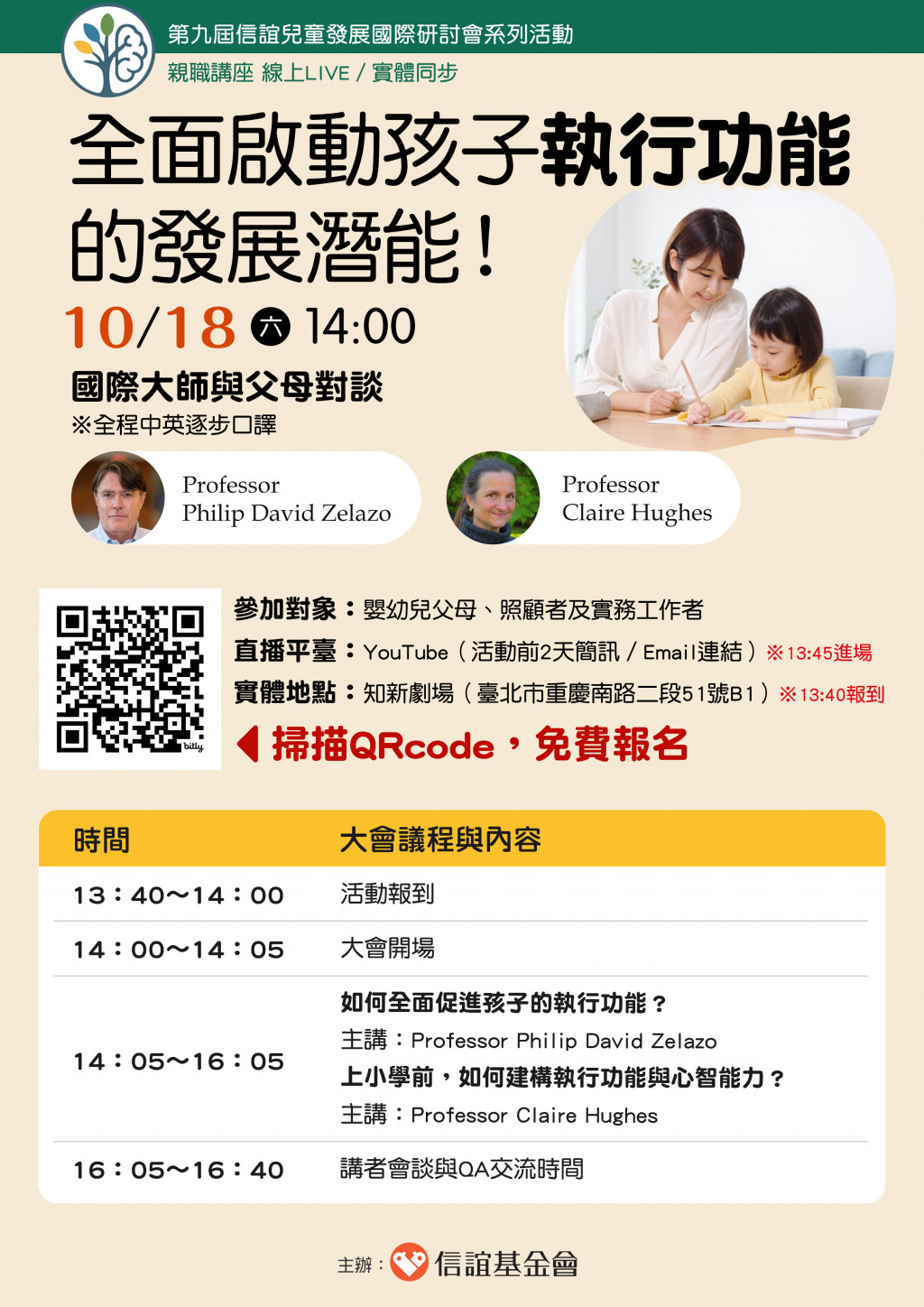 主旨:信誼基金會於10/18(六)舉辦第九屆兒童發展國際研討會親職講座【國際大師與父母對談:全面啟動孩子執行功能的發展潛能!】敬請轉知 貴校家長、老師,免費報名參加。