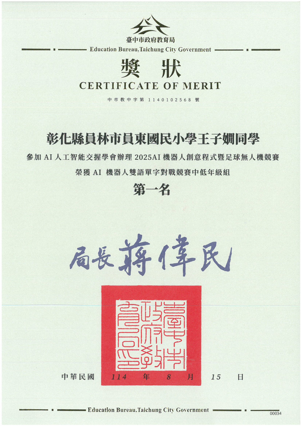 三甲 王子嫺同學 榮獲AI機器人雙語單字對戰競賽中低年級組 第一名