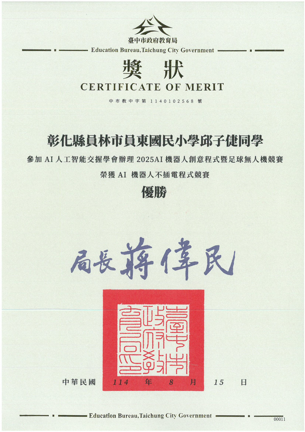 四丙 邱子倢同學 榮獲機器人不插電程式競賽 優勝
