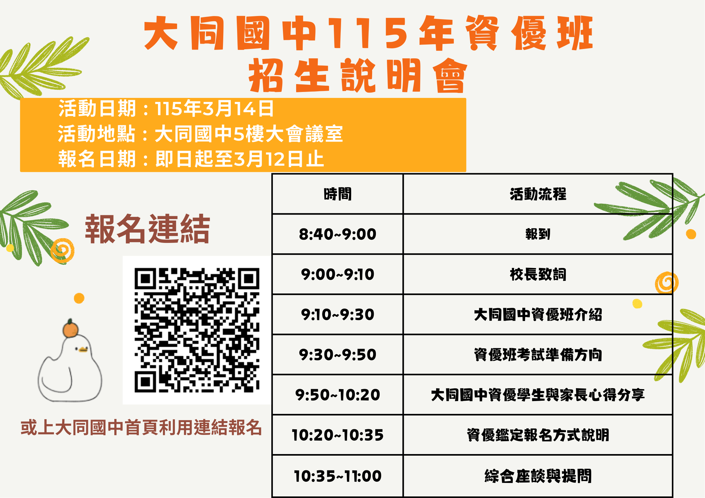 | 一、 | 本校將於115年3月14日(星期六)本校辦理「大同國中115年資優班招生說明會」,懇請協助轉知貴校有興趣的國小五、六年級家長。本活動報名時間為即日起至115年3月12日止,一律採google表單進行線上報名,網址:https://reurl.cc/rrV9Lk。 |